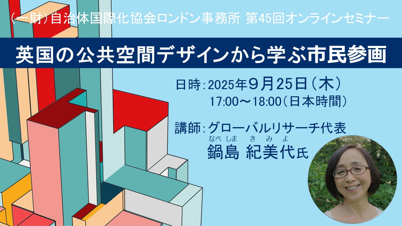 | 2025/9/25 (第45回) | 「英国の公共空間デザインから学ぶ市民参画」 | グローバルリサーチ代表 鍋島紀美代氏 | ・資料(PDF) ・報告書(PDF) |