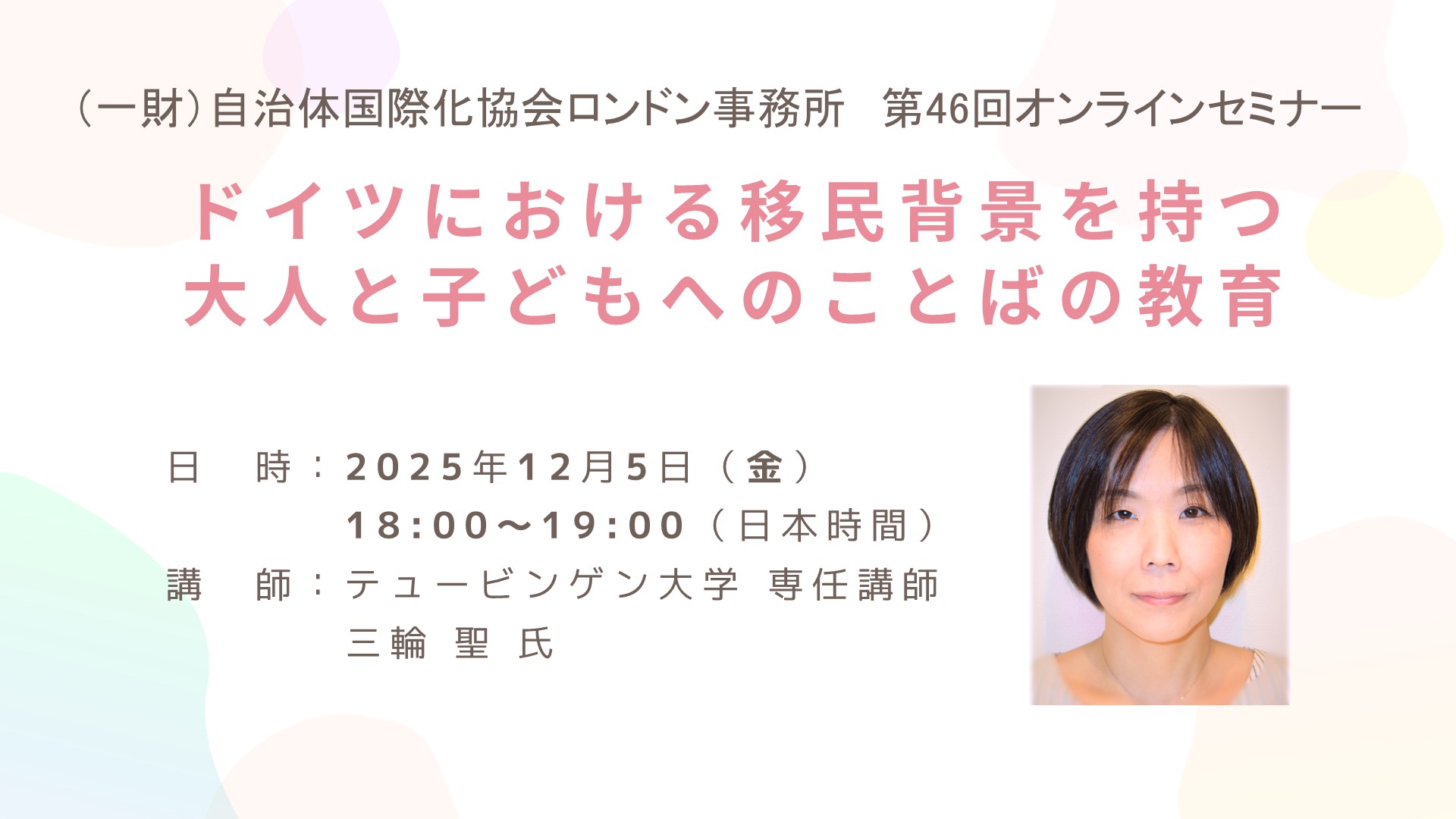 第46回オンラインセミナー「ドイツにおける移民背景を持つ大人と子どもへのことばの教育」開催のお知らせ ———————————————————————————————————————————————————